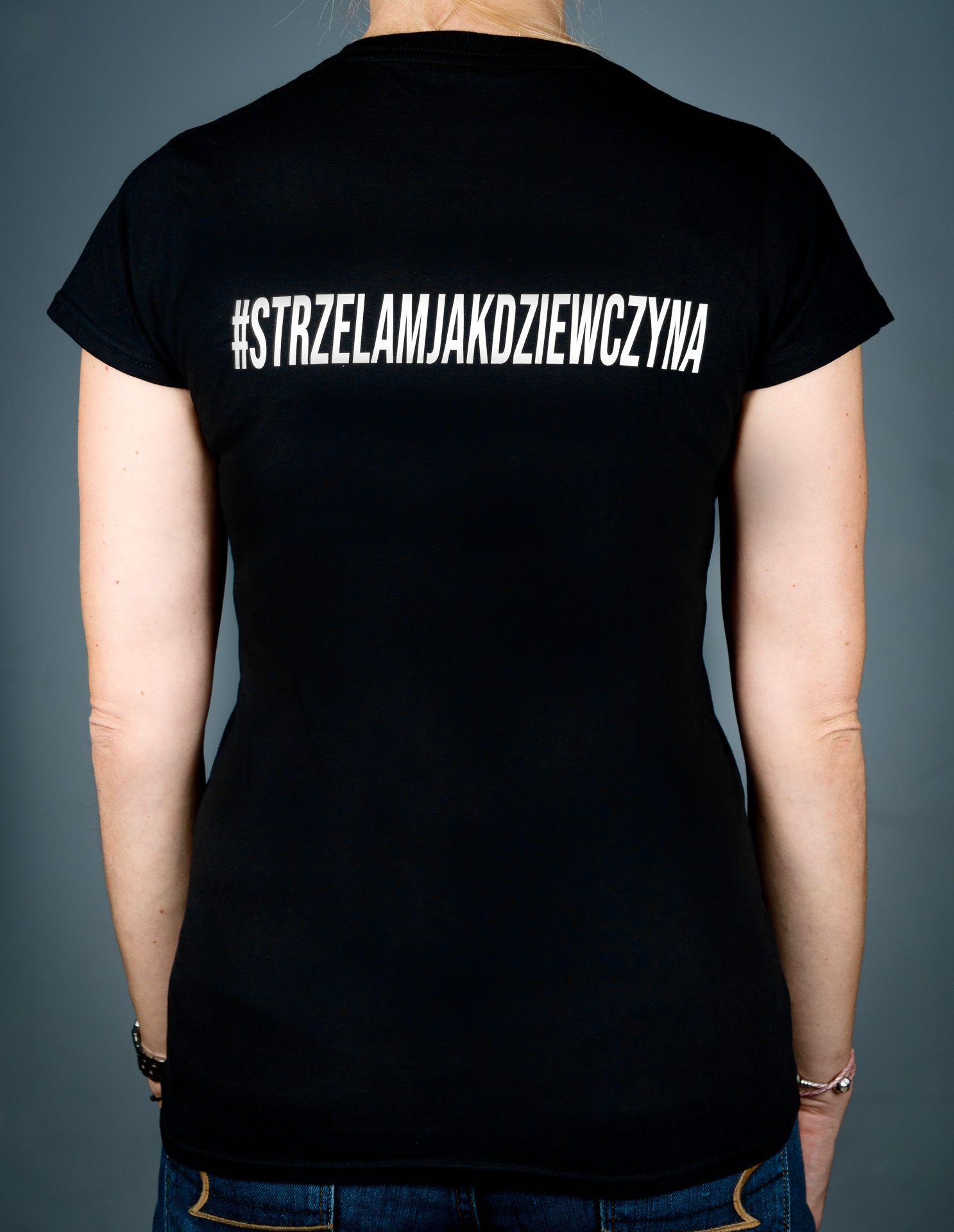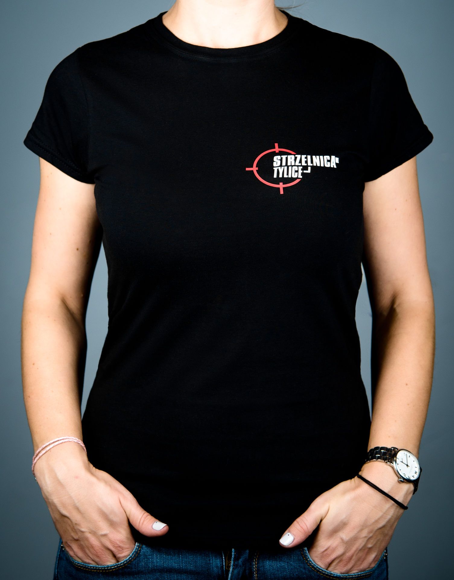 Koszulki damskie w rozmiarze: S, M, L, XL, z przodu logo Strzelnica Tylice na piersi.